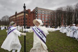 Following relocation to Bridgeton, an area figuring in the worst 5% of areas experiencing deprivation in Scotland, into our first permanent home, we again chose to mark this milestone through work with creative. The March of Women project (2015) became a triumphant declaration of survival and our arrival in a new neighbourhood. This collaboration with the Royal Conservatoire of Scotland (RCS) involved complex processes of engagement leading to a large-scale public performance/artwork. March of Women enabled us to forge a connection between the collection, participants (in par¬ticular local women and their families) choreographers, professional actors, filmmakers, photographers and composers and our collections and learning teams working over the course of a year with over 100 women in the adaption and re-enactment of Cicely Hamilton’s suffragette play, A Pageant of Great Women. The agency of creatives ensured our first major project in our new home, sent a visually arresting and unequivocal message about GWL and our work, rooted in the campaigning histories of women (in Glasgow and globally) participatory, active within and beyond our building, (re)claiming the space and streets around it. This was an act of bravery on a range of registers not least as banners and sashes paraded in the streets were freighted with significance in a neighbourhood still closely associated with sectarian division.