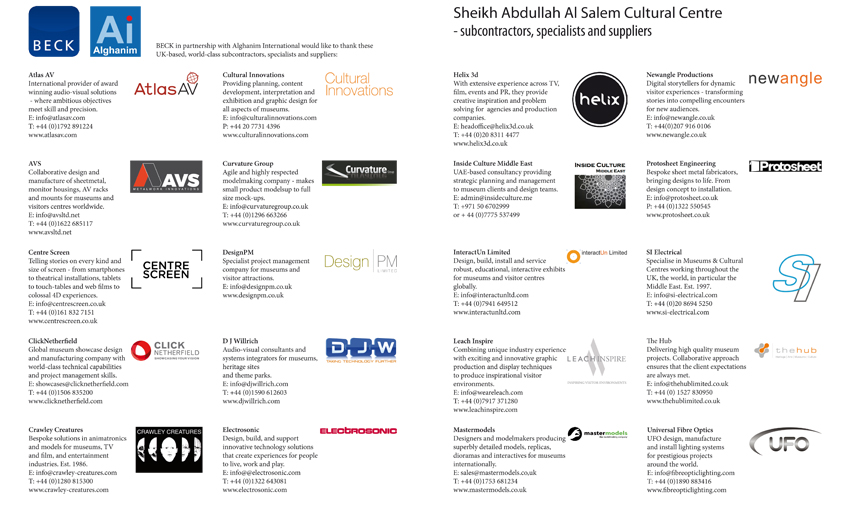 The delivery of Sheikh Abdullah Al Salem Cultural Centre could not have been achieved without the fantastic support of the client – Amiri Diwan and the hundreds of team members from across the globe. Every trade from setworks, interactives and showcases to audio visual hardware integration, multimedia and film production, lighting and graphics along with hundreds of model makers, scenic artists, sculptors, metalworkers and aquarium suppliers made the impossible, possible.