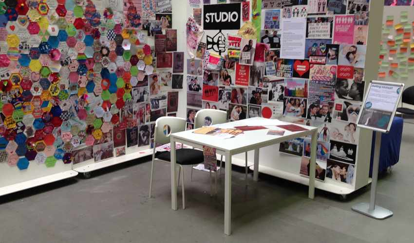 A key focus over the summer was Work in Progress (12 July – 14 September 2014), an evolving, experimental space, where visitors came to do, not to see. The exhibition made Play Your Part visible, including relocating my office within the exhibition and conducting all meetings on public view. I extended an open invite to groups to come and use the space for meetings, workshops and events and overall we delivered 18 events as part of an evolving events programme. Groups also created displays about their campaigns and the exhibition grew over the course of its run. We also included a Debate Space with rolling news broadcasts, headlines of the day and space for visitors to leave comments about topical issues.