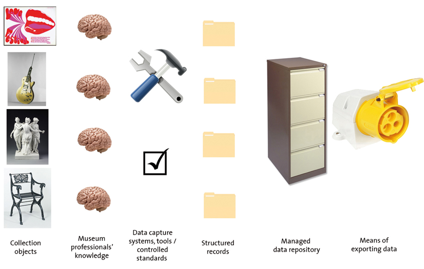 Figure 2 shows a simplified process that represents the process of creating digital assets. In this example the expertise of curatorial and other museum staff maintaining the central collection catalogue accumulates information and knowledge creating standardised structured records that can be exploited later.