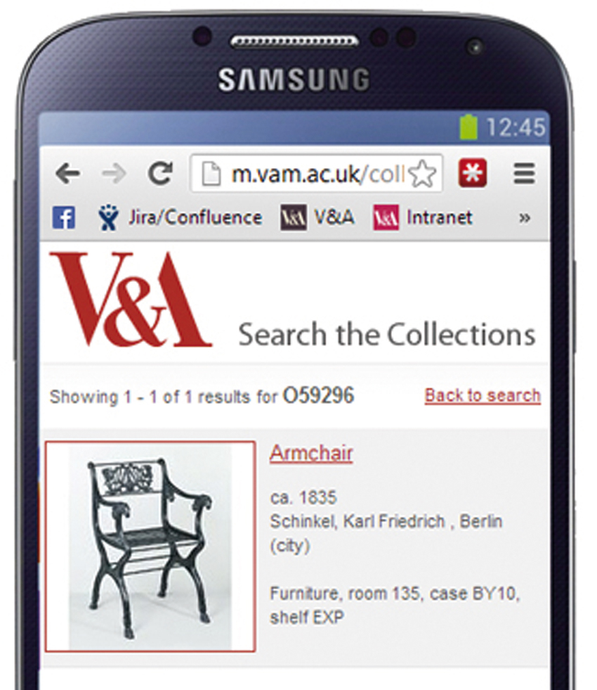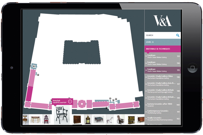The final example is the V&A’s Digital Map, which we launched in a beta version in early 2013. This is an interactive web replacement for the inflexible PDF map. It was built with mobile users in mind, optimised for tablet users, and responsive for mobile phones. It uses very small file-size SVG vector images files for fast downloading. The map is enhanced with information about events in the museum and objects in the rooms, which are yet another way the same digital assets are re-utilised. Figure 9 shows the same chair within the context of visitor orientation within the building. The darker pink room silhouette is a room that has been touched on the screen. This has then caused the map to display the furniture objects that are in that room. The list of items is created automatically by checking the collections API for what is in the room, then serving up the relevant digital assets to display the latest information available.