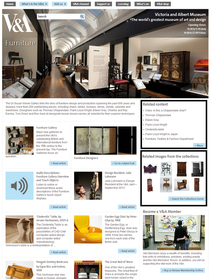 Figure 6 shows these single-source, multiple presentation principles in action on the main Furniture subject-page on the V&A website. The automated presentation of data is on the right hand side of the page highlighted with boxes. From top to bottom, these are: the content API matching other related articles, a grid of images showing items of furniture from the collections data base, a call to action to buy a V&A furniture book from the shop database, and a furniture-related museum event from the What’s On database. The chair previously shown in Figures 4 and 5 appears on this page in the image grid, fed from the Collections API.
