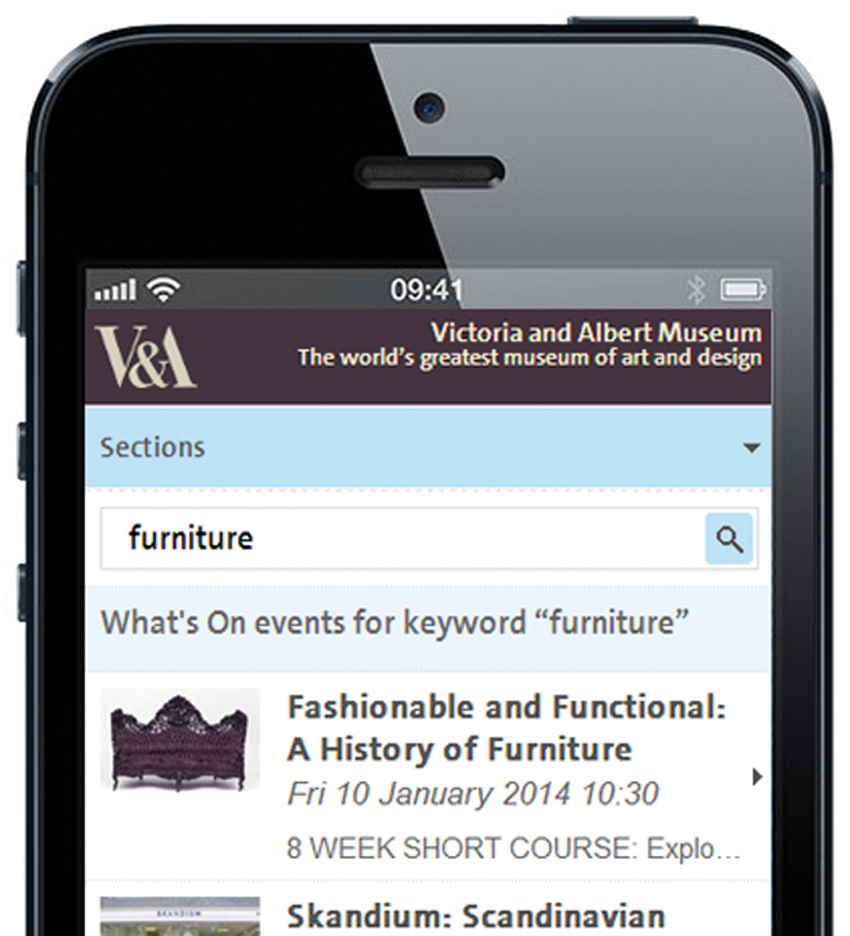 Here you can see events from the museum’s event management database, re-presented in a mobile-optimised What’s On search result. The top result is the same event that was automatically promoted on the Furniture page in Figure 6.