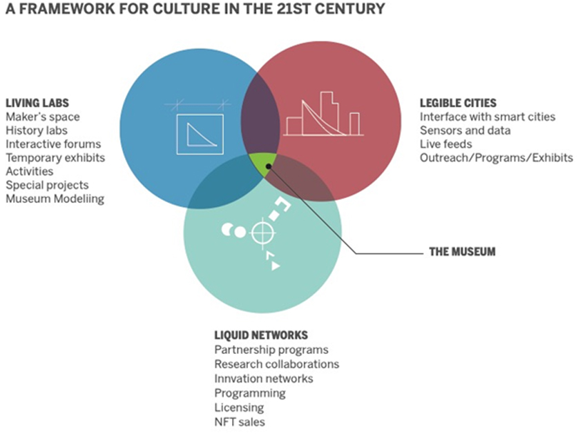 “A 21st century museum will be flexible and responsive, connected via multi-platform networks to a broader range of audiences. They will have shared industry resources like living labs, content repositories, smart technology, and can rapidly develop new exhibits and programs. This is a museum designed to reinvent the future”